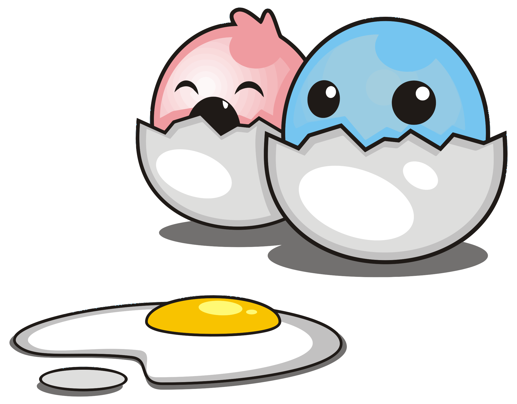 This features a delightful scene of two cartoon chicks hatching from their eggs. They are both sitting on top of the eggs, which are placed in a bowl. One egg is located towards the left side of the scene, while the other egg is situated more towards the center. A fried egg can be seen in front of them, adding to the playful atmosphere of the image. The chicks themselves are blue and pink colored, making for an appealing visual display.