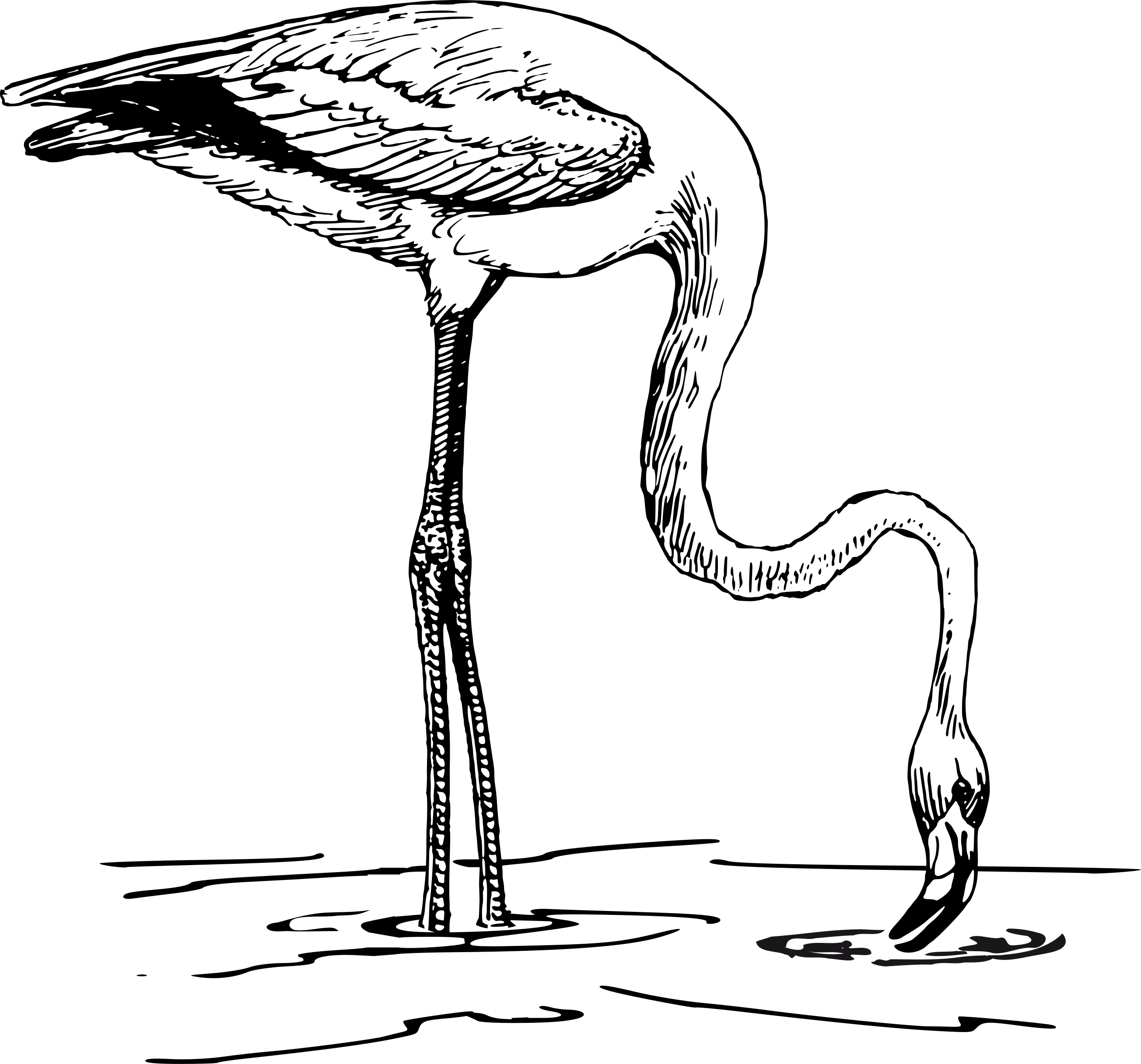 This features a black and white illustration of a flamingo standing on one leg in the water. It appears to be drinking from the pond, with its long legs and curved beak visible as it reaches down towards the water. The bird's feathers are depicted in a contrasting color scheme, adding depth and detail to the drawing. This artistic representation of a flamingo captures the beauty and elegance of these unique birds in their natural habitat.