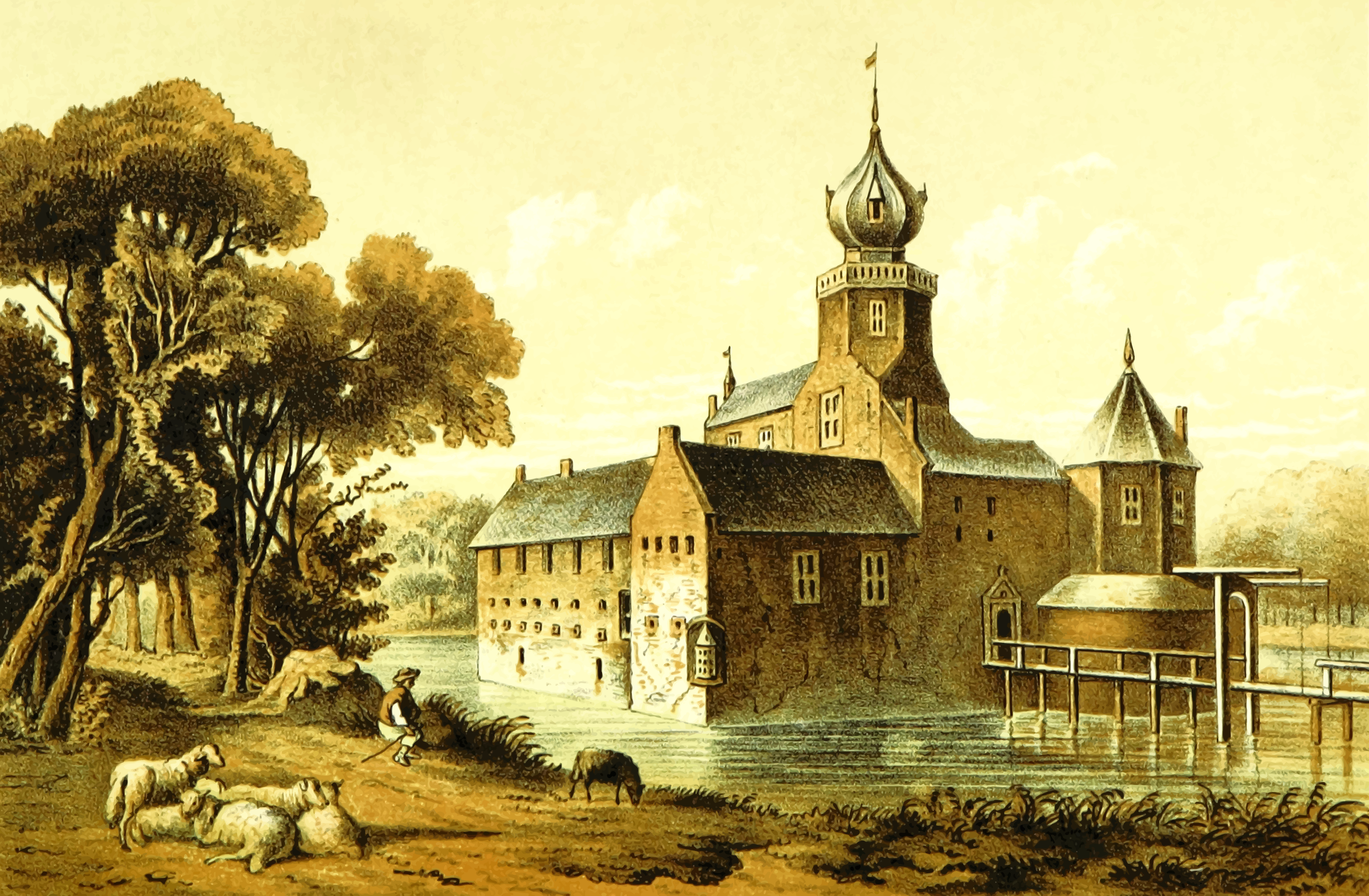 This features a large, old brick building with a clock tower on top. It is situated next to a body of water and has a pier extending out into the water. There are several sheep grazing in the foreground, adding a peaceful atmosphere to the scene. In addition to the sheep, there are two people present in the image, one closer to the left side and another nearer to the center. The overall setting appears to be a serene countryside location with a picturesque view of the building by the water.