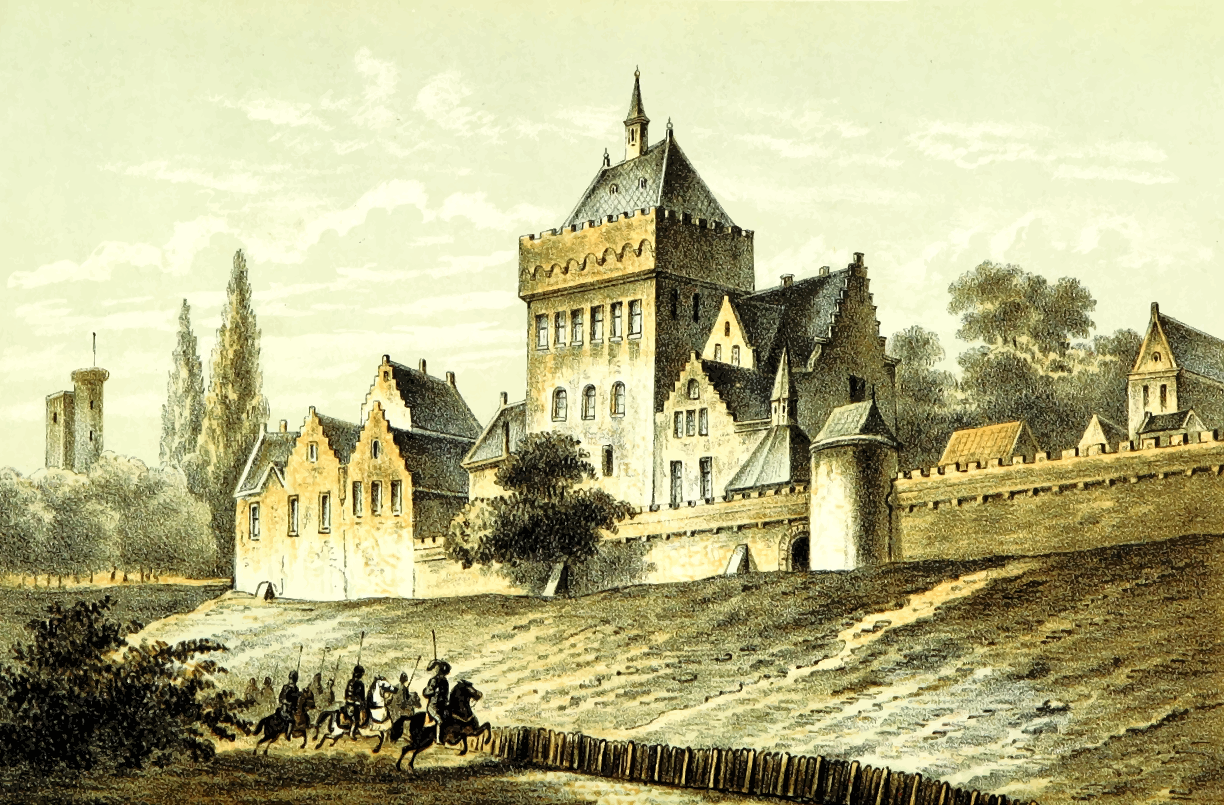 This depicts a historical scene of people riding horses in front of an old, large castle. There are several individuals on horseback, with some closer to the foreground and others further back. A few people can be seen walking near the castle as well. The castle is surrounded by a moat, which adds to its grandeur. In addition to the main building, there are smaller structures in the background, such as a windmill. Overall, it's an intriguing and captivating scene that showcases the historical architecture of the time.
