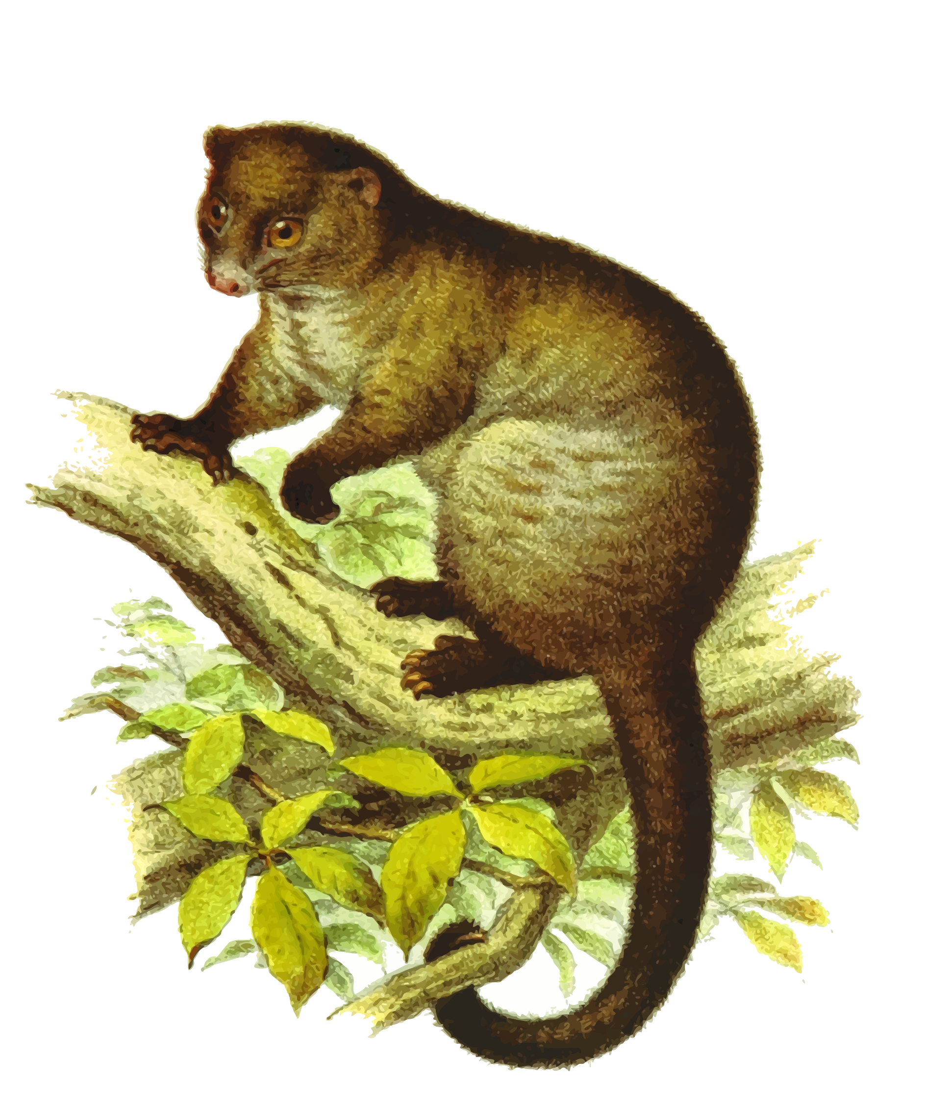This features a brown and white animal, possibly a monkey or a squirrel, sitting on top of a tree branch. It appears to be looking down at the ground below it. The scene is set against a backdrop of a white background, which highlights the animal's presence in the foreground. The image captures the natural habitat and behavior of this creature as it perches on the branch, possibly observing its surroundings or searching for food.