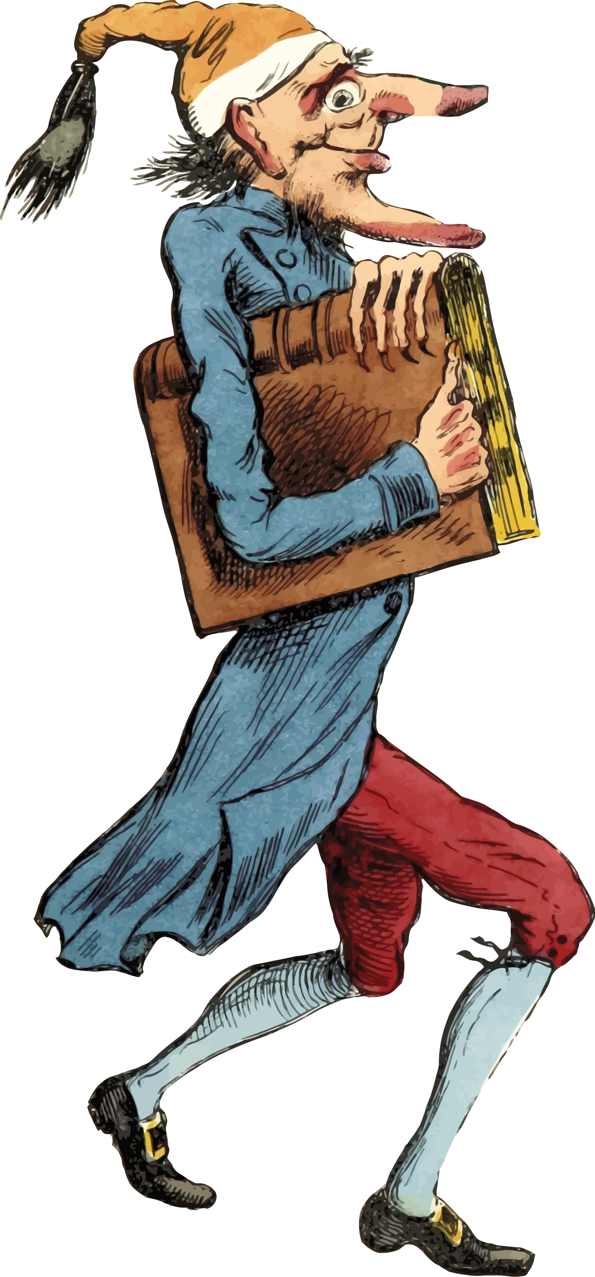 This features a man dressed in a blue and red outfit, carrying an open book on his shoulder. He appears to be walking or running with the book, possibly engaging in some form of performance or entertainment. The man's attire suggests that he might be a clown or a performer, as he is wearing a hat and holding a book. The scene seems to take place outdoors, as there are no visible walls or other structures surrounding the man.