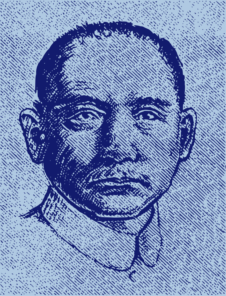 This is a black and white drawing of an older man with a mustache. He appears to be wearing a tie, which is visible on his neck. His facial expression seems somewhat stern or serious as he stares directly into the camera. The drawing has a vintage feel to it, giving it a classic appearance.