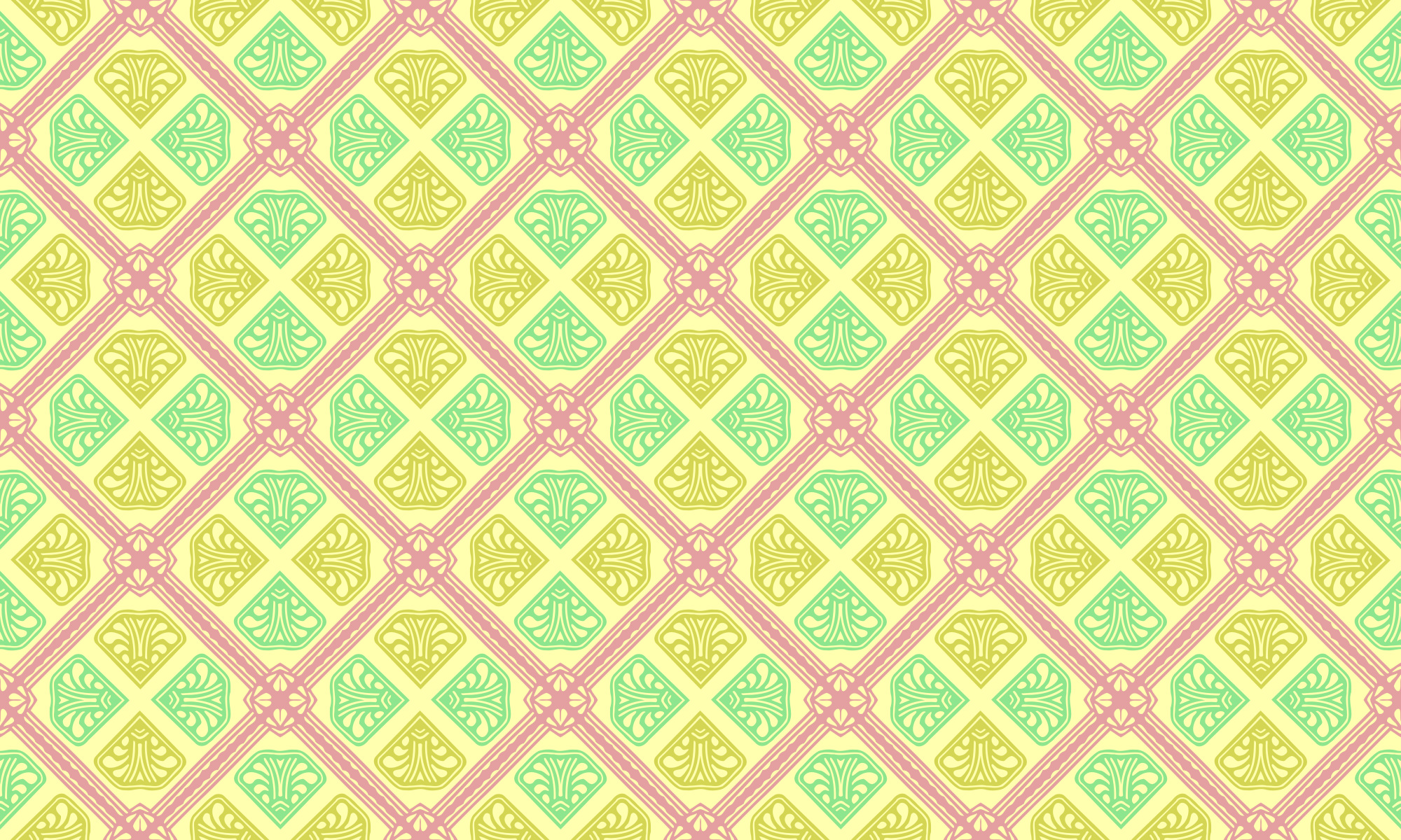 This features a yellow and green patterned wallpaper with a pink border. The wallpaper is adorned with various geometric shapes, including diamonds and squares, creating an intricate design. The colors of the wallpaper are predominantly yellow and green, with some pink accents on the edges. This unique pattern adds a touch of vibrancy to any space it covers.