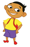 This features a cartoon character, possibly a young boy or a man with a smile on his face. He is wearing a yellow shirt and has a red backpack on his back. The character appears to be standing in front of a white background, which adds emphasis to the colorful nature of the character's attire. The overall appearance of the cartoon character suggests that he might be from an animated show or comic book.