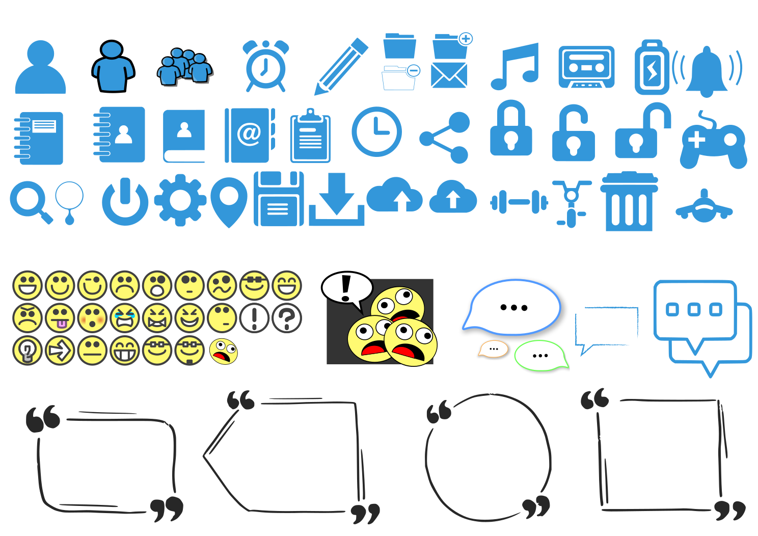 This features a collection of various blue icons and emojis, including a clock, a book, a laptop, a cell phone, a TV, a camera, a music player, a lock, a trash can, and a game controller. There are also several yellow emojis scattered throughout the scene. Additionally, there is a set of chat boxes with black outlines, indicating that this could be an illustration or design for a social media platform or messaging app. The combination of these elements creates a visually engaging and diverse collection of icons and emojis.