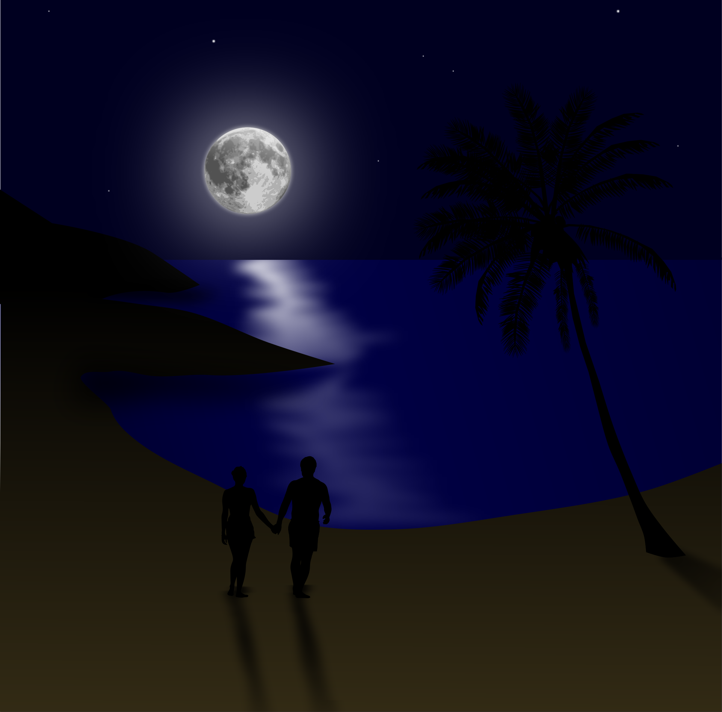 This depicts a couple walking on the beach at night, with the moon illuminating their path. They are holding hands as they stroll along the shoreline, enjoying each other's company in the peaceful atmosphere. In the background, there is a palm tree standing tall and providing a sense of tranquility to the scene. The beach setting and the couple's connection create an intimate and romantic ambiance for this nighttime stroll.