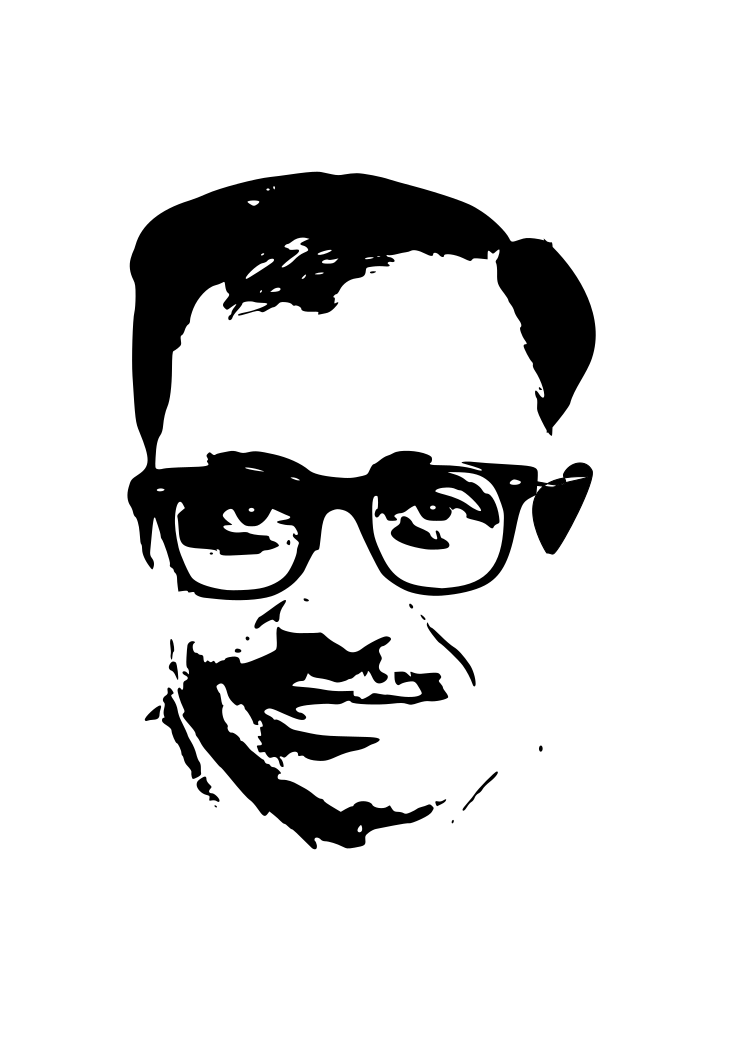 This is a black and white photo of an older man wearing glasses. He has a mustache, and his head is turned slightly to the side. The man appears to be smiling as he looks at something off-camera. His attire includes a tie, which adds a formal touch to the overall appearance. The image captures a moment in time, showcasing the man's unique features and style.