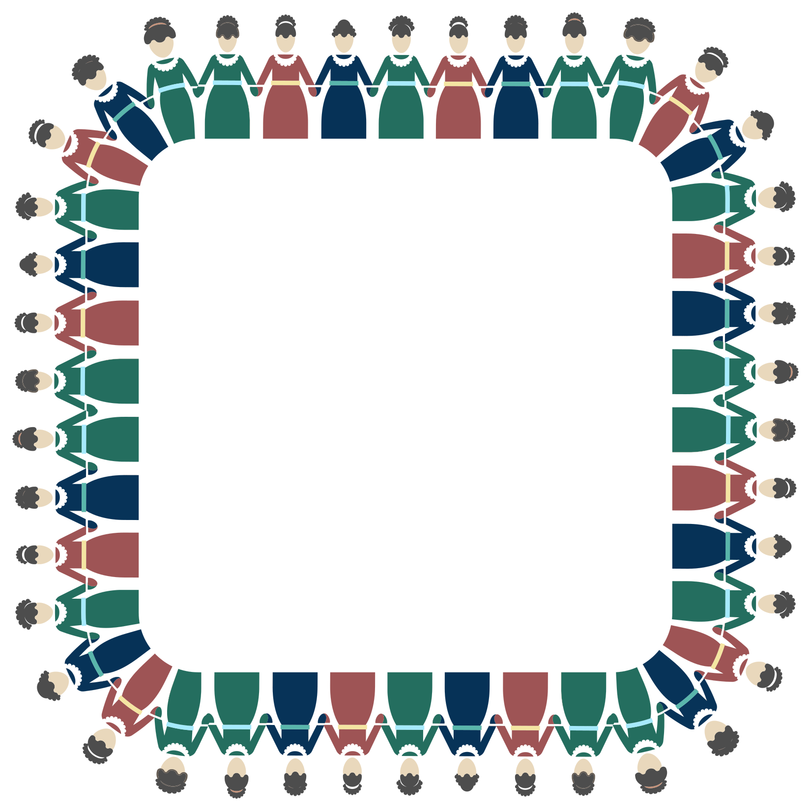 This features a large group of people standing in a circle, all wearing different colored dresses. There are at least 13 individuals visible in the scene, each dressed in unique outfits that represent various colors and styles. They appear to be posing for a picture or participating in an event where their attire is important. The group of people is arranged in such a way that they form a circle around a central point, which could be a focal point for the image or simply a representation of unity among the individuals.
