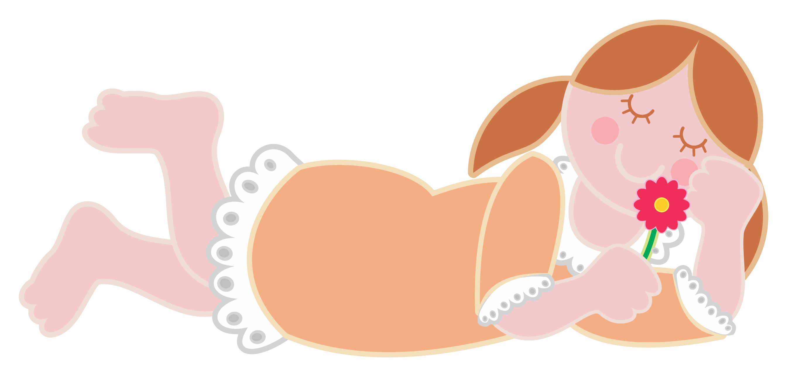 This features a little girl laying on her stomach, wearing a dress and holding a red flower in her hand. She appears to be sleepy or resting comfortably. The scene is depicted with a pink background that adds a touch of warmth to the overall composition.