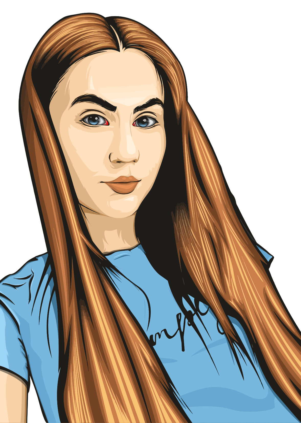 This features a woman with long, red hair and a blue shirt. She is posing for the camera, looking directly at it. Her eyes are open wide, giving her an intense expression. The woman's hair appears to be in a ponytail, adding to her overall appearance. The drawing of the woman has a vibrant color scheme, making her stand out against the background.