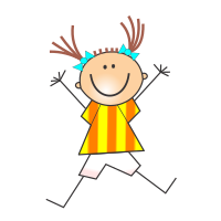 This features a cheerful cartoon character, a young girl with pigtails and two blue bows in her hair. She is wearing an orange and yellow striped shirt and white shorts. Her arms are raised above her head as she jumps for joy, displaying a sense of excitement and happiness. The overall atmosphere of the image is lively and energetic, capturing the essence of childhood innocence and playfulness.