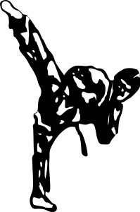 This features a black and white silhouette of a person doing a kick in the air. This action-packed scene is reminiscent of karate, as it captures the essence of movement and power. The figure appears to be wearing a uniform, suggesting that they are an athlete or martial artist. The image itself is a black and white photo, which adds to its artistic appeal and emphasizes the contrast between light and shadow. Overall, this striking silhouette conveys a sense of strength and agility, making it an excellent representation of karate culture.