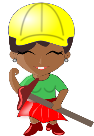 This features a cartoon of a woman wearing a yellow hat and holding a guitar. She is smiling, giving the impression that she is enjoying herself while playing her instrument. The woman's outfit includes a green shirt and a red skirt, adding to the overall colorful appearance of the scene. The cartoon is set against a white background, which helps to emphasize the vibrant colors of the woman's clothing and the guitar she holds.