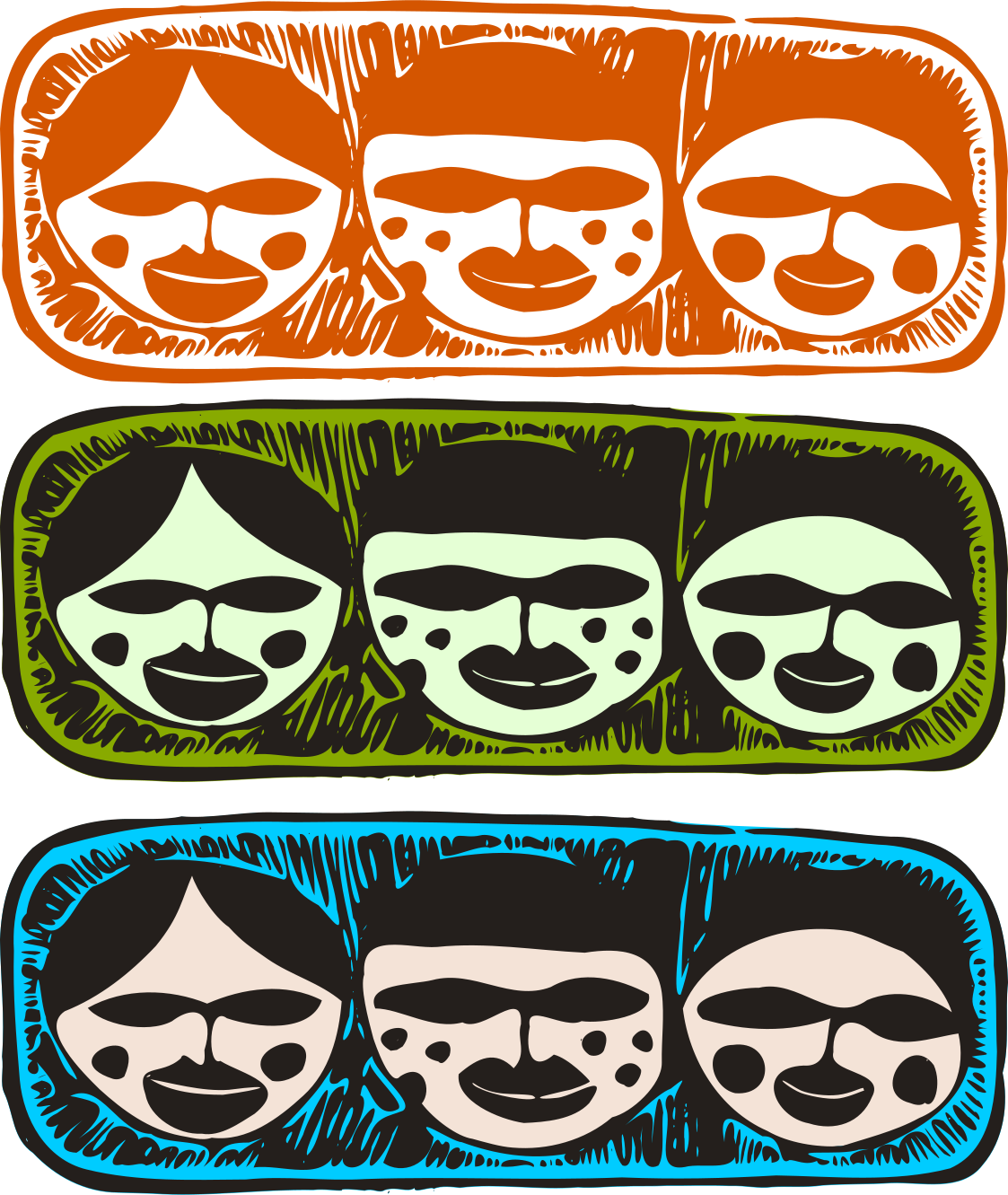 This features a series of four colorful, hand-drawn faces with different colored backgrounds. Each face is unique and has distinctive features such as eyes, noses, mouths, and ears. They are arranged in a row, showcasing the artistic design and creativity behind each individual portrait. The colors used for the backgrounds include blue, green, orange, and yellow, adding vibrancy to the overall composition of the image.