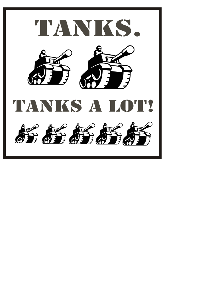 This features a sign that says "Tanks! A Lot!" with several tanks displayed on it. There are five tanks in total, each varying in size and positioned across the sign. Some of the tanks are located towards the top left corner, while others can be found near the center or bottom right side of the image. The overall design of the sign is simple yet effective in conveying its message to viewers.