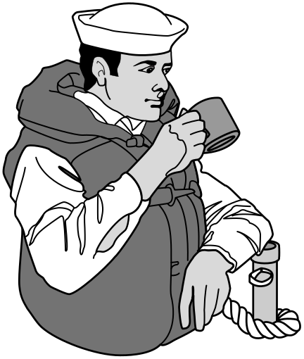 This features a man wearing a sailor's uniform, sitting down and holding a coffee mug in his hand. He appears to be enjoying the warm drink while taking a break from his duties. The man is also wearing a backpack, which suggests that he might be on a journey or traveling for work. The scene captures a moment of relaxation and enjoyment for the sailor amidst his daily tasks.