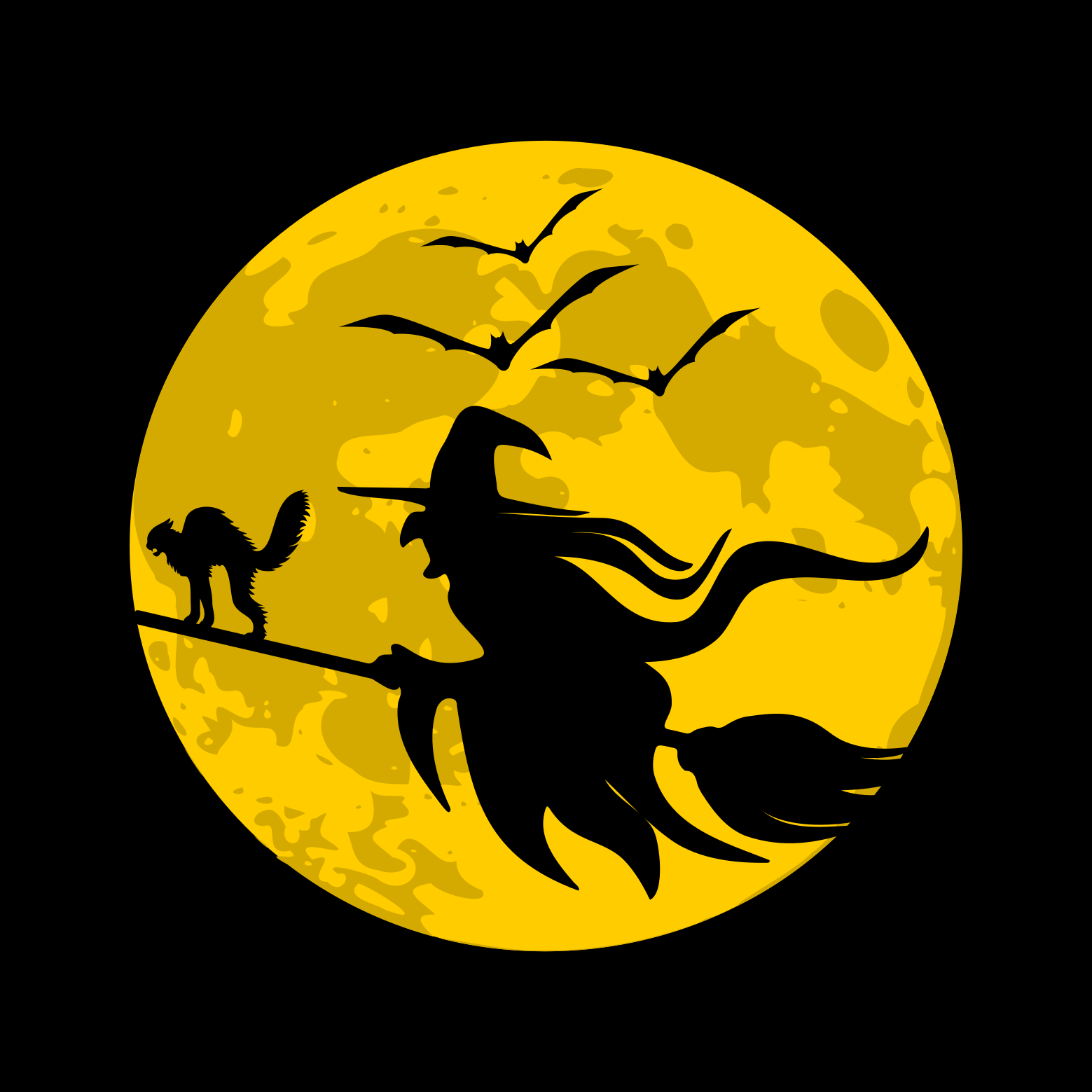 This features a witch on a broom, flying through the air with a cat perched atop it. Behind them is a moon in yellow color, creating an enchanting atmosphere. There are also several birds scattered throughout the scene, adding to the overall charm of the image. The combination of the witch, cat, and moon creates a captivating visual that evokes feelings of magic and wonder.