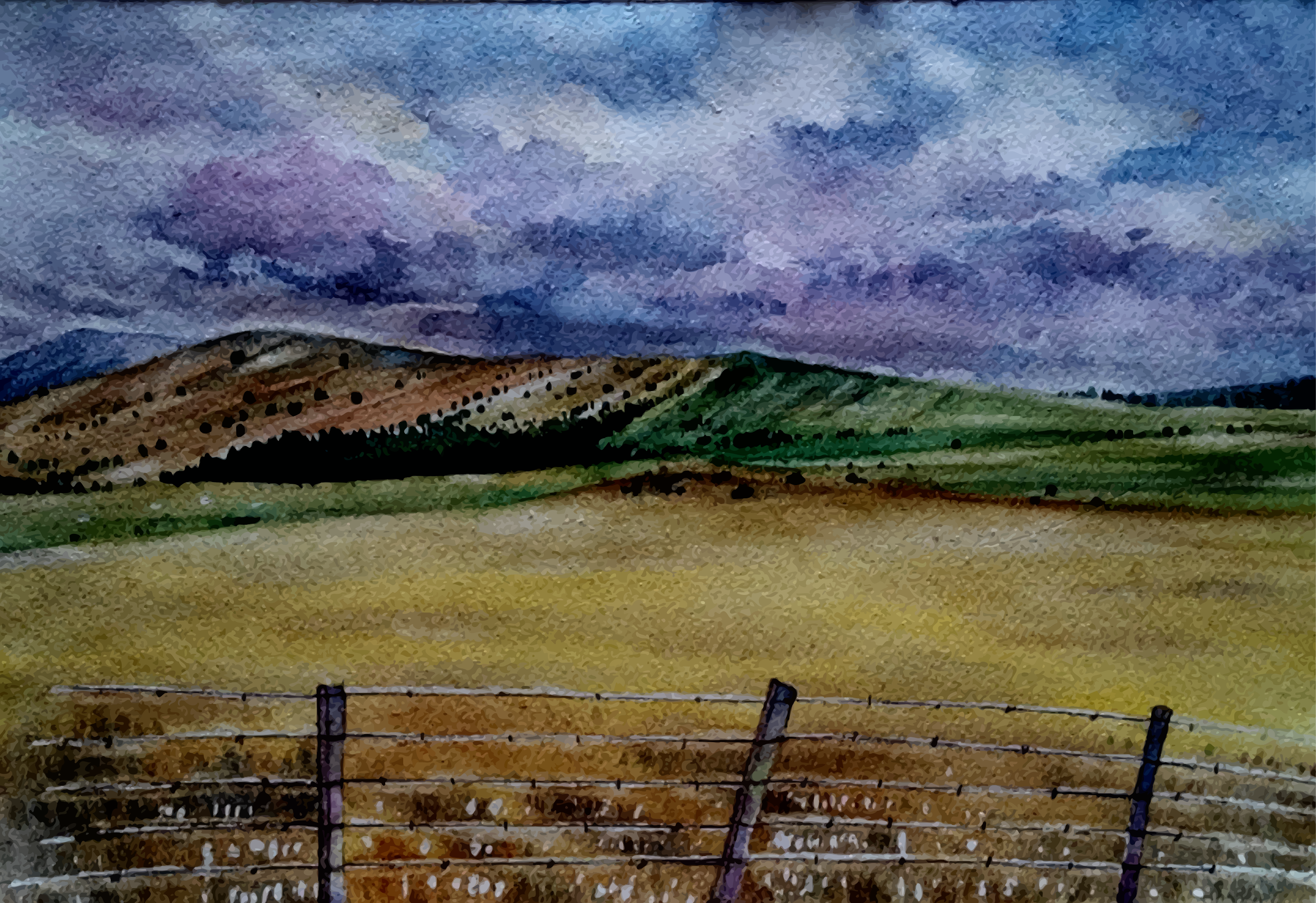 This features a large, open field with a fence running through it. The fence is made of metal and has barbed wire on top to keep out unwanted visitors. In the background, there are mountains visible, adding to the picturesque scenery. The sky above the field appears cloudy, creating an atmospheric backdrop for this serene landscape.