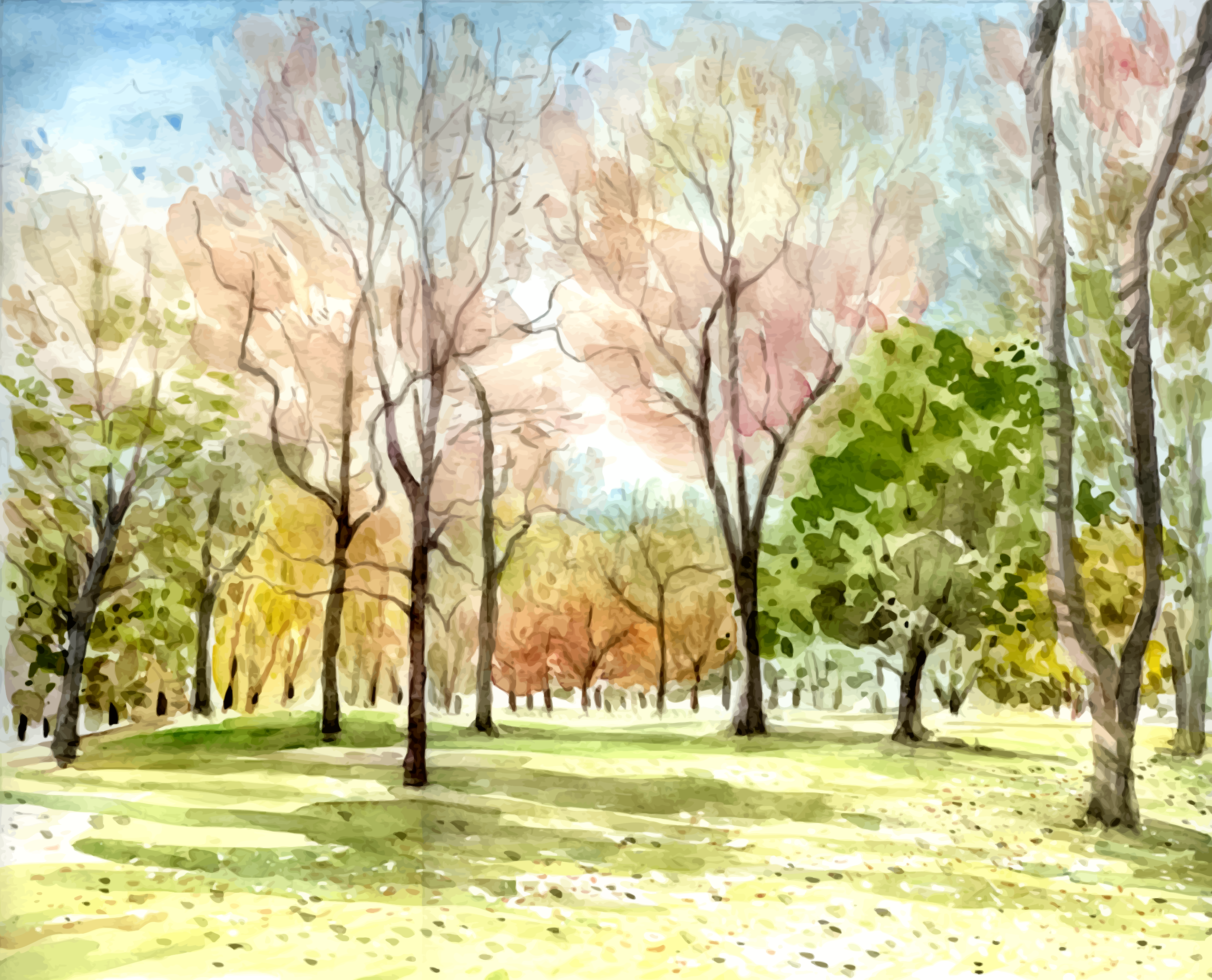 This features a beautiful park with many trees, some of which are bare and others have leaves. The trees are scattered throughout the scene, creating a picturesque landscape. In addition to the trees, there is a grassy field that extends across the park, providing an open space for visitors to enjoy. The overall atmosphere of the image is serene and inviting, making it an ideal location for relaxation or outdoor activities.