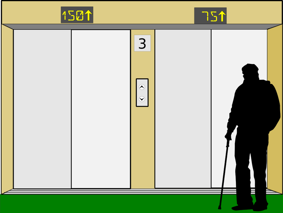 This depicts a man standing in front of an elevator, holding a cane. He appears to be waiting for the elevator doors to open so he can enter it. There are several other people in the scene, but they are not as prominent and do not seem to be interacting with the main subject. The image is black and white, giving it a classic feel.