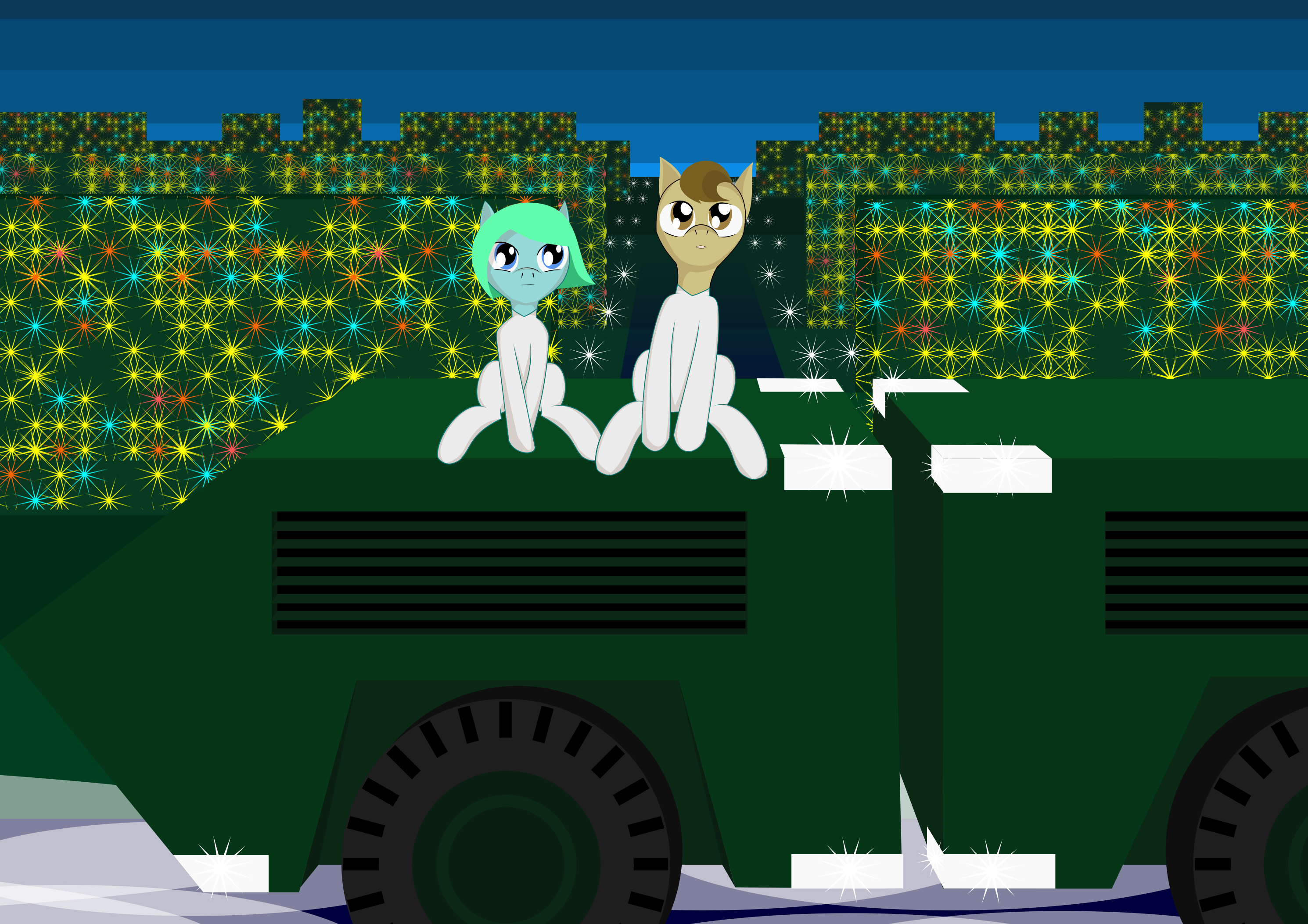 This features two unicorns sitting on a green vehicle, possibly a tank or truck. They are positioned close to each other and appear to be enjoying their time together. One of the unicorns is looking up at the night sky, while the other seems to be observing something else in the distance. The scene gives off a sense of adventure and curiosity as these mythical creatures explore their surroundings.