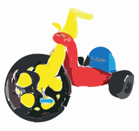 This features a colorful children's bicycle with a unique design. It has one large tire and two smaller ones, giving it an interesting appearance. The seat is blue and red in color, while the handles are yellow. This creative bike is designed to be both fun and functional for young riders.