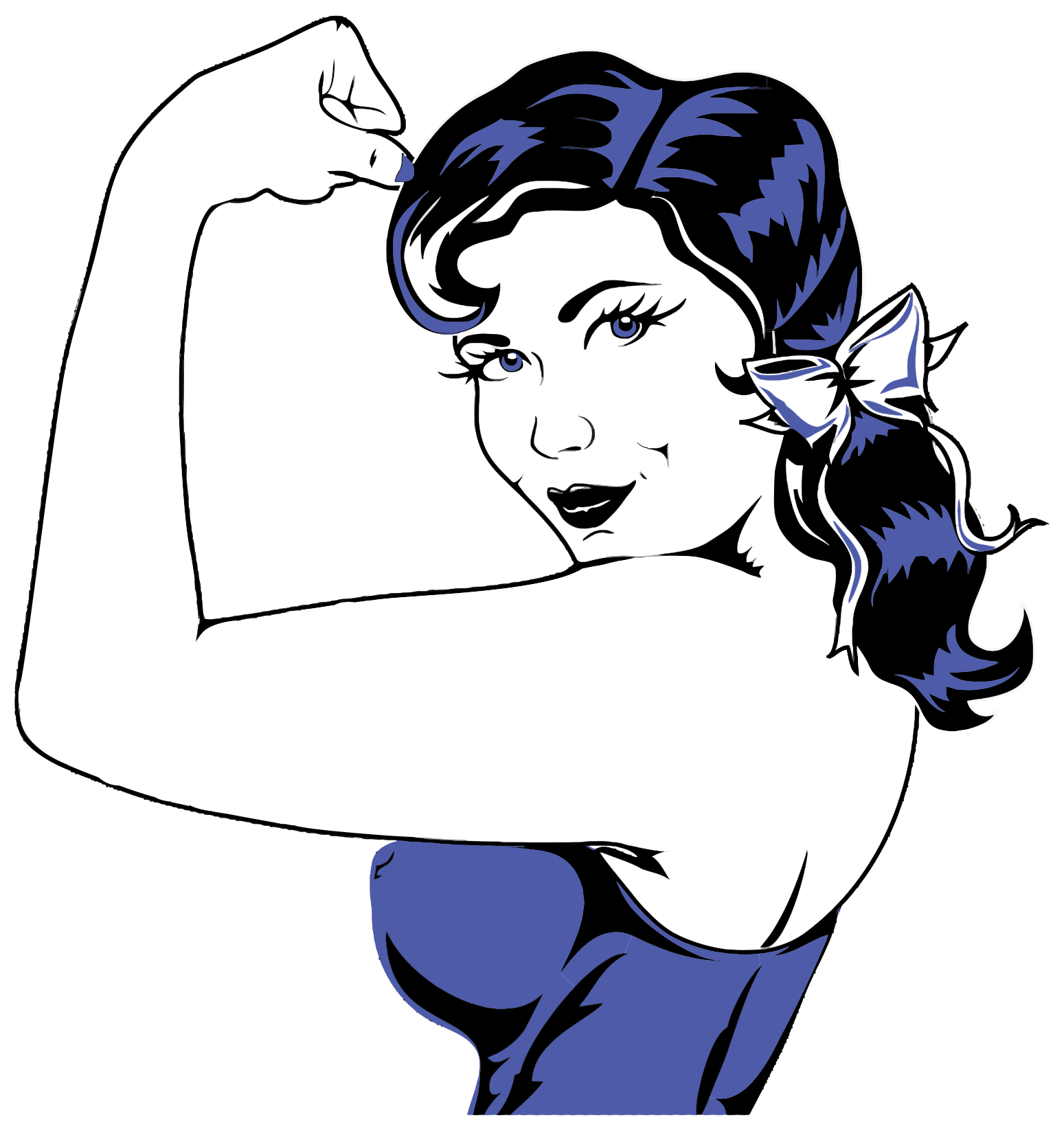 This features a woman with blue hair, wearing a purple corset top and holding her arm up in the air. She has a white bow tied in her hair, adding an elegant touch to her appearance. Her pose suggests strength and confidence as she showcases her muscles. The overall style of the illustration gives off a retro vibe, with the woman's blue hair and purple corset top contributing to this nostalgic feel.