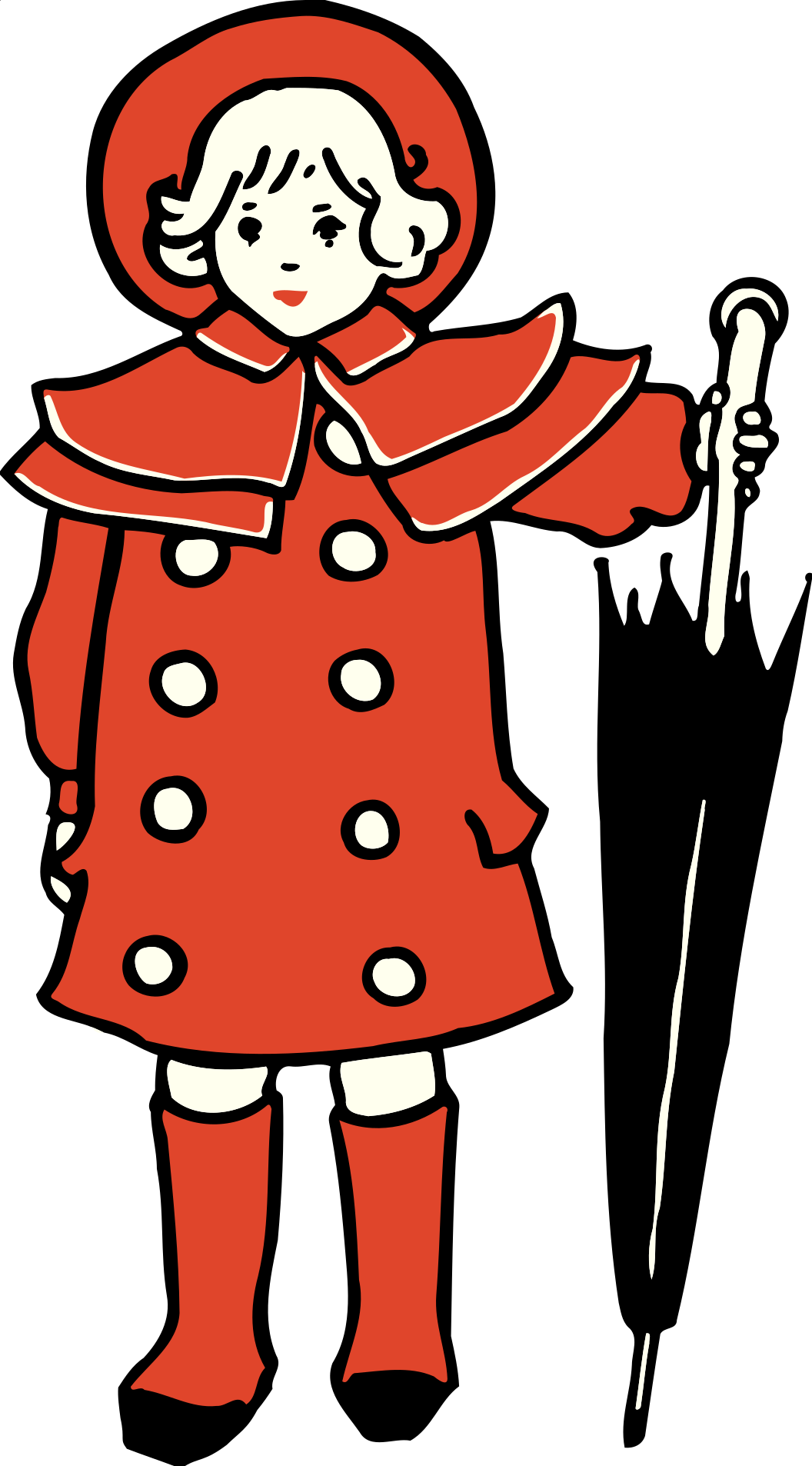 This features a little girl dressed in a red coat and holding an umbrella. She is standing next to the umbrella, which appears to be black and white in color. The girl's outfit includes a hat, adding to her overall appearance. The scene seems to depict a rainy day, as she is prepared with her umbrella.