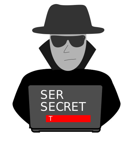 This features a man wearing sunglasses and a black hat, with his face covered by a mask. He is standing in front of a laptop computer that has the words "SER SECRET" written on it. The man appears to be looking at the camera while hiding behind the mask. The scene gives off an air of mystery and intrigue as the man's identity remains concealed.