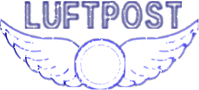 This features a blue and white logo for Luftpost, which is an air mail service. The logo consists of a winged design with the word "Lufthansa" written in white on it. The wings are spread out across the entirety of the image, giving it a sense of motion and flight. The overall appearance of the logo gives off a vintage feel, reminiscent of an old-fashioned rubber stamp.