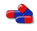 This features three red and blue colored capsules, each with a black outline. These capsules are arranged in such a way that they appear to be stacked on top of one another. They are placed against a white background, which provides a clean and simple backdrop for the capsules. The vibrant colors of the capsules make them stand out prominently against the white surface, drawing attention to their unique design.