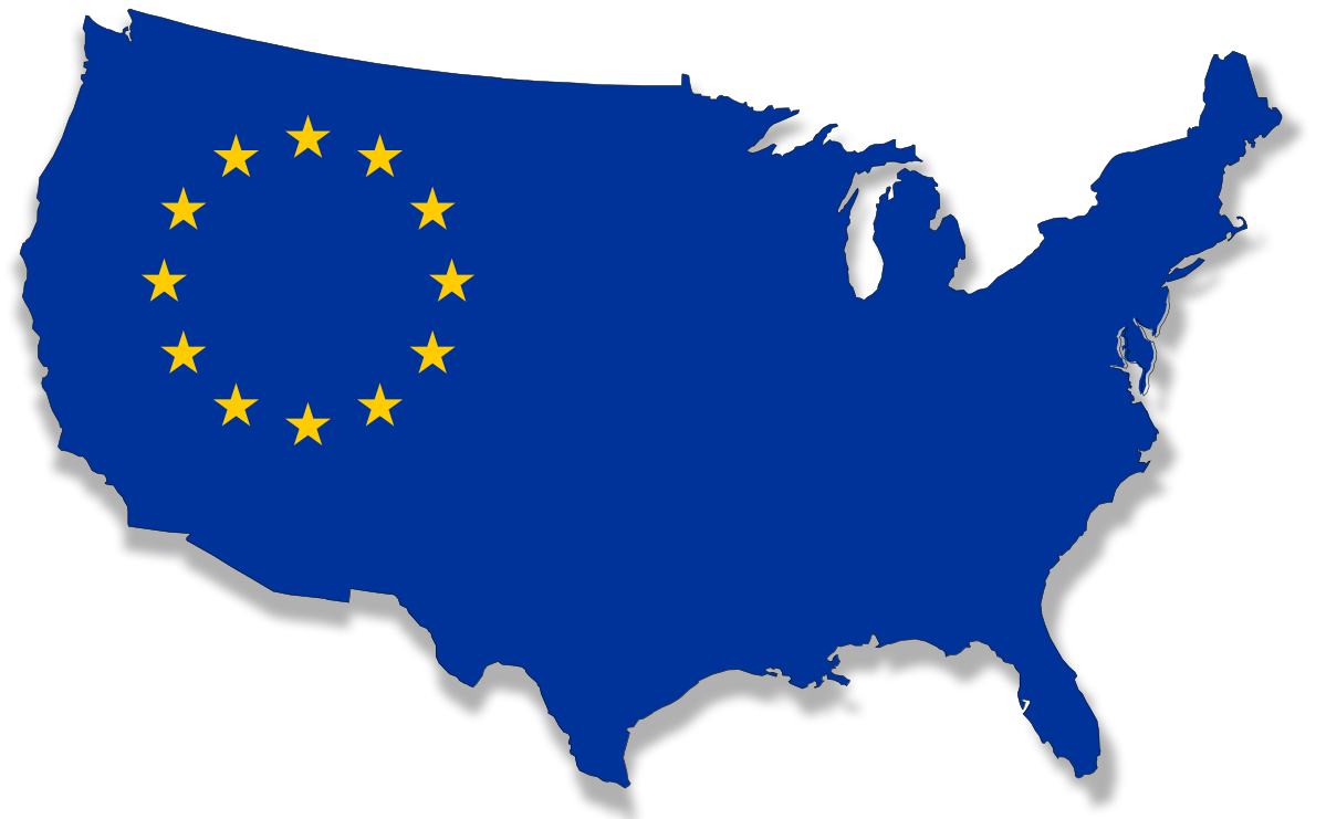 This features a large blue flag of the European Union, which is displayed prominently over the United States. This flag represents the union between various countries in Europe and signifies their cooperation and shared values. The flag covers most of the image, with its vibrant colors and distinctive design making it stand out against the backdrop of the American map. The combination of these two flags highlights the importance of international collaboration and unity across different regions of the world.