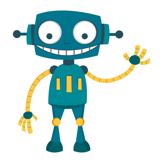 This features a cartoon robot with a big smile on its face, giving the impression of being friendly and welcoming. It has a blue color scheme and is holding out its arms in a gesture that appears to be waving or greeting someone. The robot's design includes various parts such as legs, hands, and an arm, all of which are drawn with attention to detail. Additionally, there are two small yellow circles on the robot's body, adding a touch of color to its overall appearance.