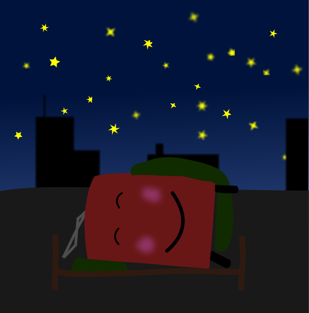 This features a red sleeping trolley, which is laying on its side. It appears to be resting in the middle of an urban setting with buildings surrounding it. The night sky serves as a backdrop for this scene, adding a sense of tranquility and mystery to the image. The trolley's unique design and color make it stand out against the darker surroundings, creating a visually striking contrast.