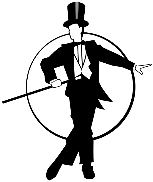 This features a man dressed in a black suit and hat, performing a dance with his cane. He is wearing a bow tie and appears to be the center of attention as he twirls around on stage. His outfit suggests that he might be a performer or an entertainer, capturing the audience's interest with his moves. The man's posture and expression convey confidence and skill in his performance, making it an engaging scene for viewers to enjoy.