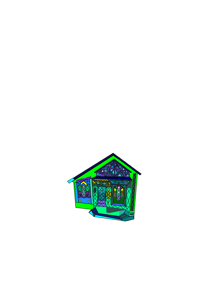 This features a small, colorful house with a green roof and yellow walls. It appears to be a three-dimensional model or a computer-generated design, giving it an artistic and unique appearance. The house is situated in the middle of a white background, which provides a clean and uncluttered backdrop for the image. This creative design could potentially serve as inspiration for architects or interior designers looking to incorporate vibrant colors and interesting shapes into their work.