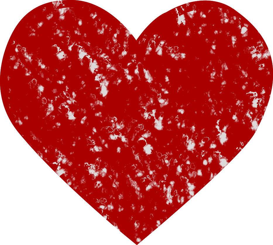 This features a large, red heart with a unique texture. This heart is notably different from the traditional smooth, rounded shape of hearts often seen in art and design. Instead, it has an intricate, textured appearance created using Inkscape's 'garden of delights' overlay filter. The filter adds depth and visual interest to the heart, making it stand out as a distinctive piece of art or design element.