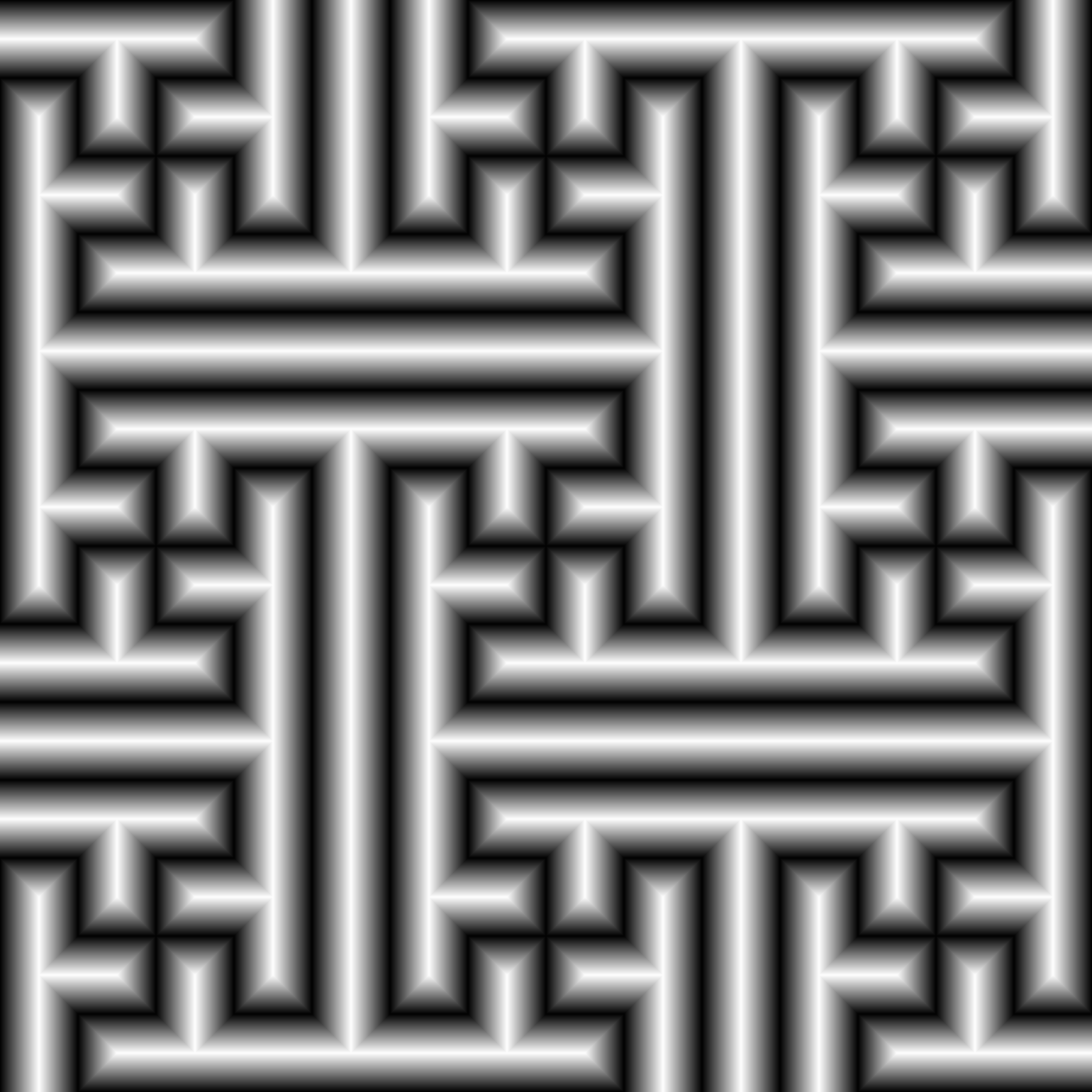 This features a complex and intricate pattern of interconnected squares, resembling a maze or a puzzle. This design is reminiscent of traditional Chinese or Japanese patterns, often referred to as swastikas or sayagatas. The pattern consists of numerous small squares arranged in various shapes and sizes, creating an eye-catching and visually appealing display. The overall composition of the image showcases a harmonious balance between simplicity and intricacy, making it an interesting visual piece.