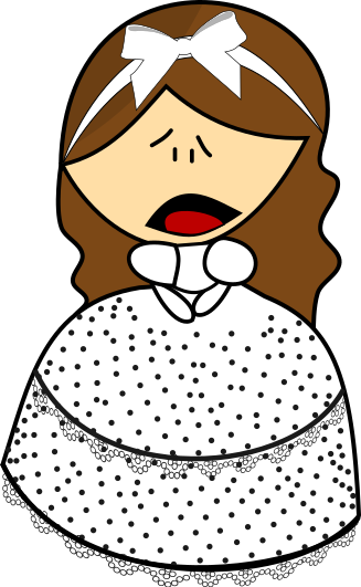 This features a cartoon drawing of a young girl wearing a white dress with black polka dots. She appears to be sad, as she is holding her mouth open and has a frowning expression on her face. Her hair is styled in a ponytail, adding to the overall cuteness of the character. The cartoon drawing captures the essence of a young girl's emotions, making it an appealing image for viewers who appreciate the artistic representation of childhood feelings.