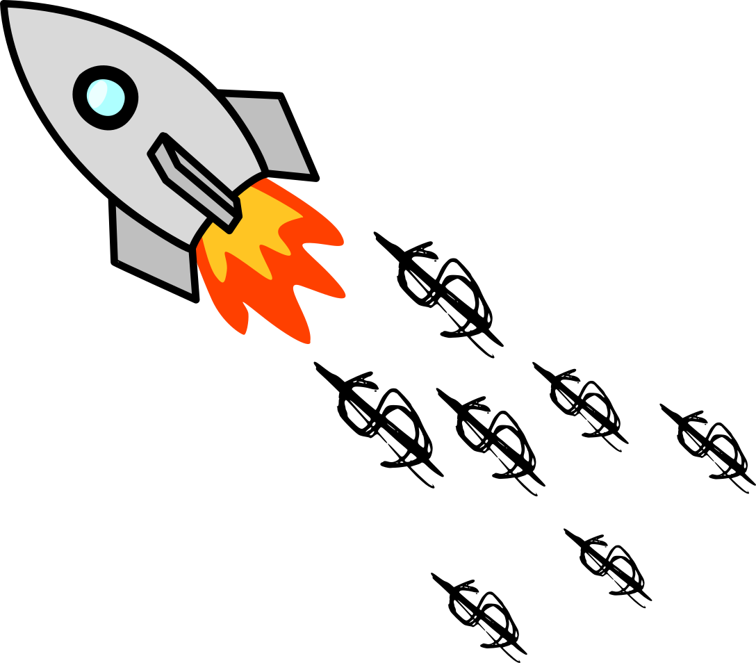This features a rocket ship flying through the air, with money falling from it. There are several dollar bills scattered throughout the scene, some of which are close to the rocket and others further away. In total, there are 13 dollar bills visible in various positions within the image. The rocket itself is positioned towards the left side of the frame, with its trail of money extending across the entire width of the picture.