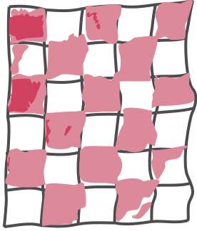 This features a large, hand-drawn checkerboard with red and white squares. Each square is filled with red paint, giving the appearance of a stained or worn pattern. The checkerboard has a unique perspective, as it appears to be un-perspective, creating an interesting visual effect. This artistic representation of a checkerboard can evoke feelings of nostalgia and creativity, showcasing the artist's skill in capturing this iconic design.