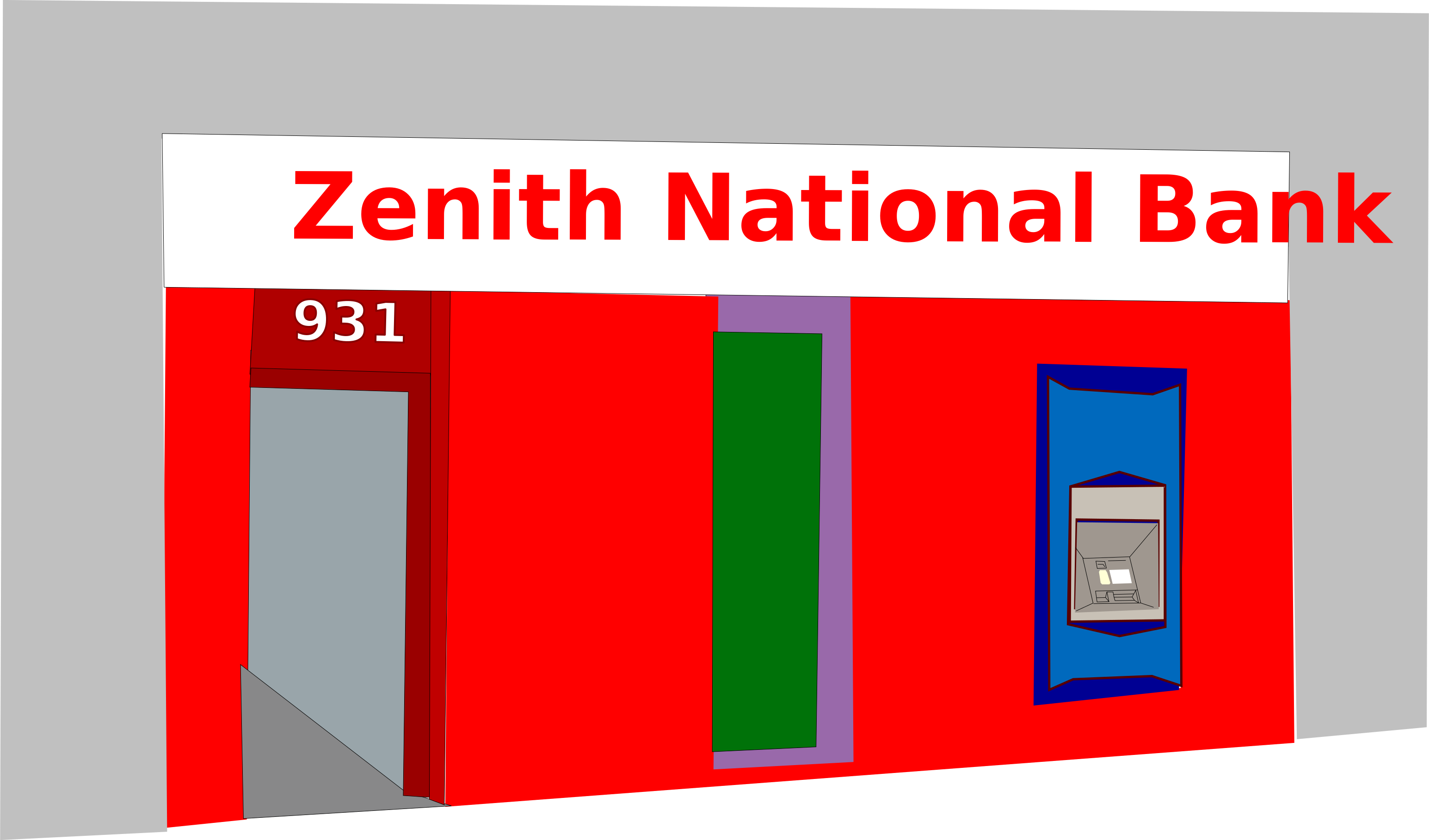 This features a red brick building with the name "Zenith National Bank" written on it. There are three doors in front of the bank, each painted different colors: one is green, another is blue, and the third is purple. Above these doors, there are four windows that add to the overall design of the bank. In addition to the doors, there are two ATM machines visible on the side of the building. One is located near the center of the image, while the other is slightly further away towards the right side. These ATMs provide convenience for customers visiting the bank and accessing their funds.