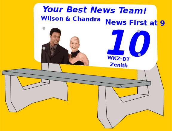 This features a sign that reads "Your Best News Team! Wilson & Chandrea News First at 9pm WKZT-DT Zenith." A man and woman are posing for the camera, with the man wearing a tie. They appear to be the news team being advertised on the sign. The sign is placed in front of a bench, which is positioned against a yellow background.