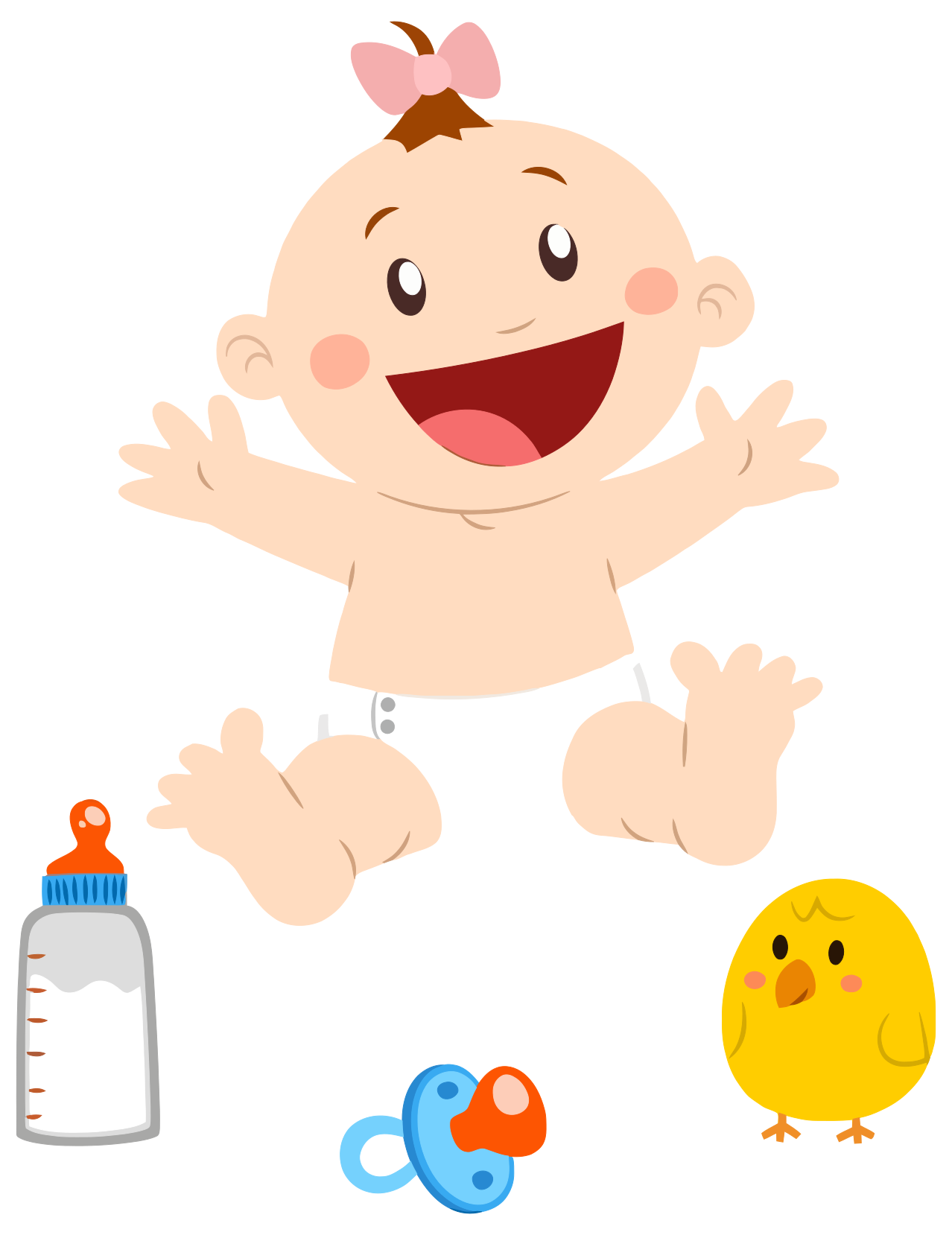 This features a baby with a pacifier in its mouth, sitting on top of a bottle. The baby is wearing diapers and has a pink bow in its hair. It appears to be smiling as it sits on the bottle. In addition to the baby, there are two stuffed animals present in the scene - one is a yellow bird located near the right side of the image, while the other is a teddy bear situated towards the left side. The overall atmosphere of the image seems to be warm and inviting, with the baby enjoying its time surrounded by these cute plush companions.
