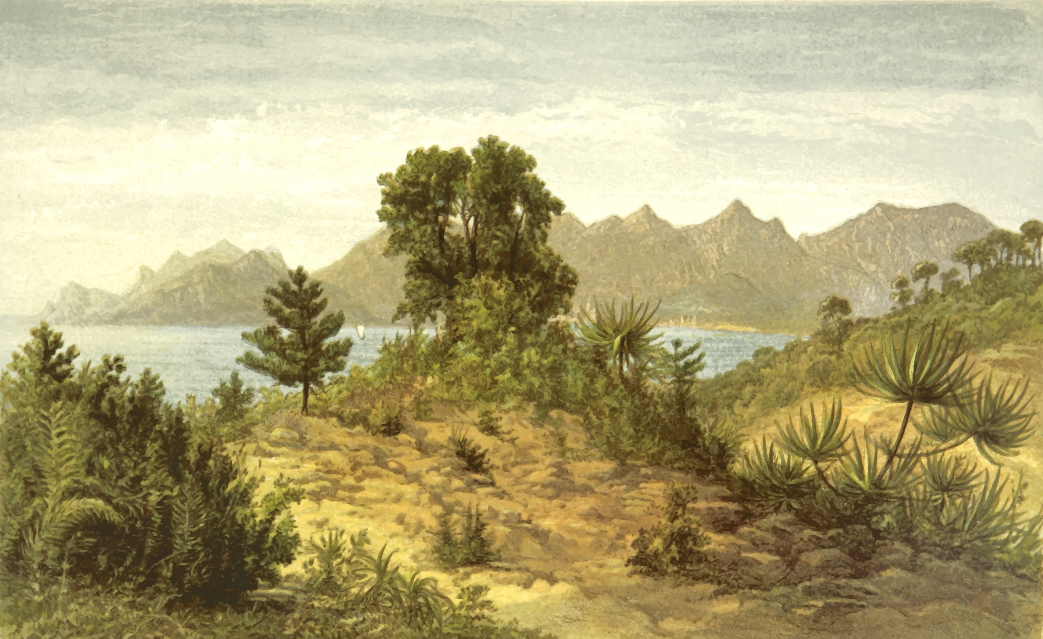 This depicts a beautiful landscape with mountains in the background and a lush green hillside. There are several trees scattered throughout the scene, some of which are located near the water's edge. A few pine trees can be seen on the right side of the image, while others are situated closer to the center. The overall atmosphere is serene and picturesque, with the mountains providing a stunning backdrop for this idyllic setting.