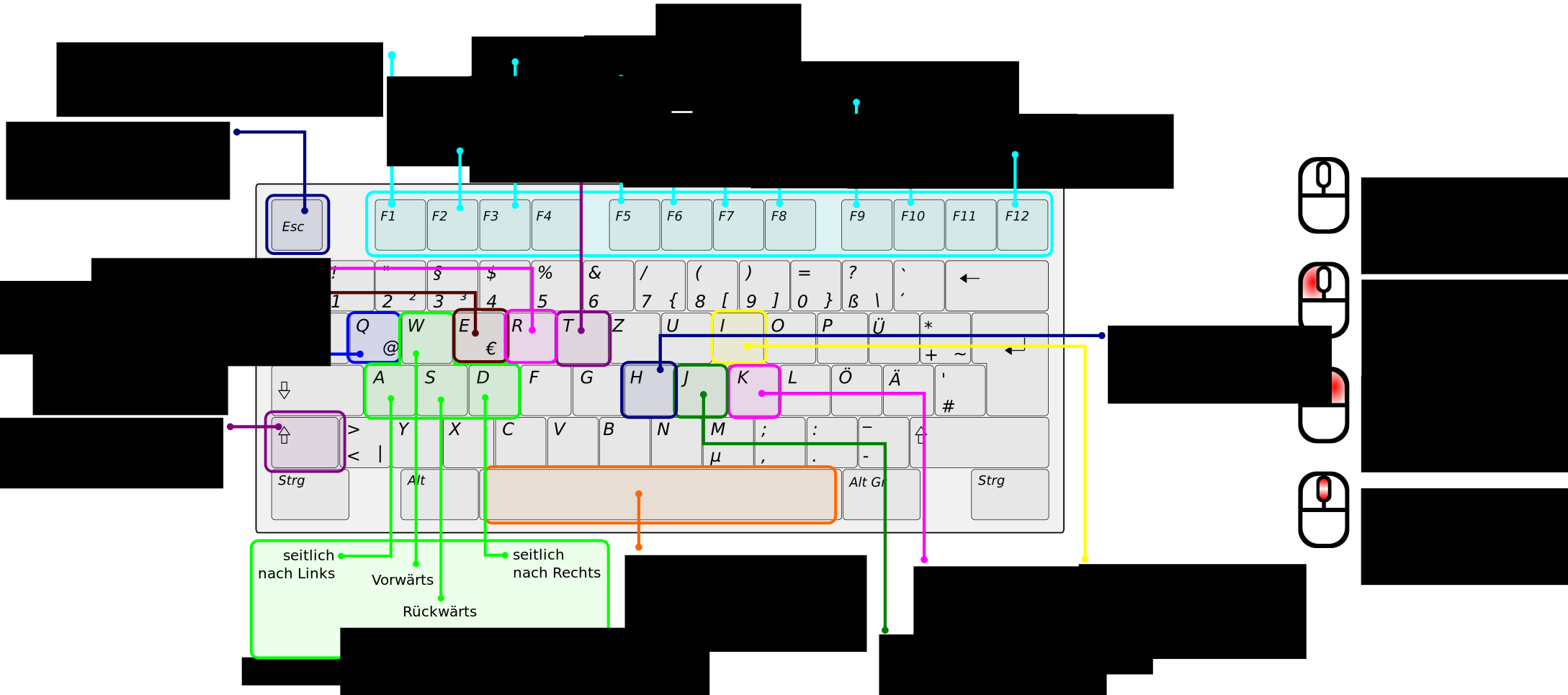 This is a diagram of a keyboard, with each key having a different color. There are arrows pointing to the left side of the keyboard, indicating mouse controls on the right side. This diagram appears to be a visual representation of a computer keyboard layout and its corresponding mouse controls.