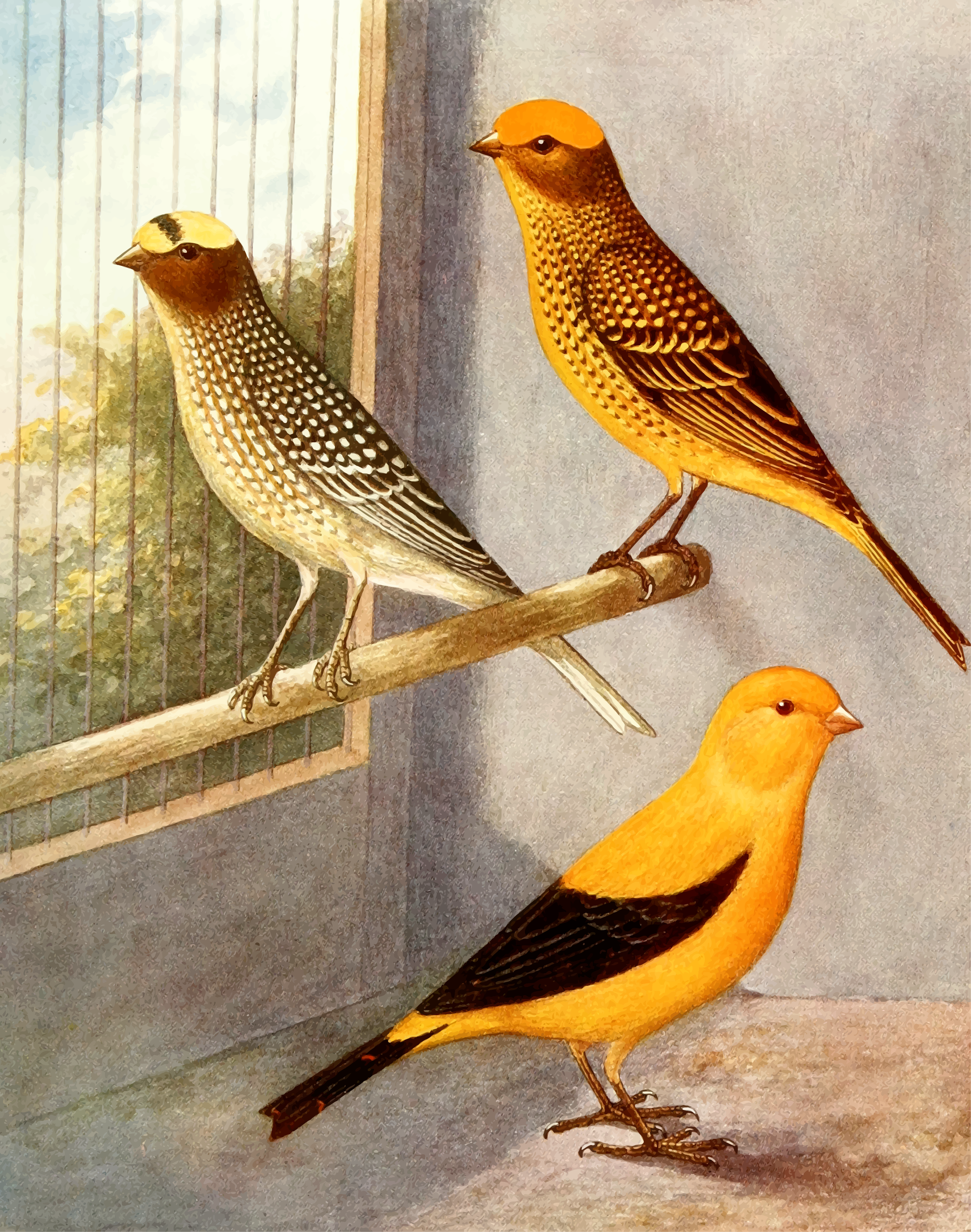 This features three birds perched on a wooden post or pole. They are all facing the same direction, possibly looking out of their cage. One bird is positioned at the top left corner, another in the middle, and the third one towards the bottom right side of the pole. Each bird has distinct colors, adding to the visual appeal of the scene. The birds appear to be enjoying their time together on the post, creating a sense of companionship among them.