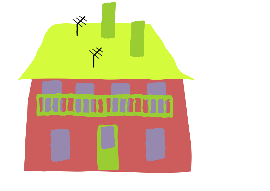 This features a large, colorful house with a green roof. It has two chimneys and is painted in various shades of red, purple, yellow, and green. The house also has a unique design element: antennas on the top of it. These antennas are likely part of an artistic or creative representation of the house, adding a touch of whimsy to its appearance.