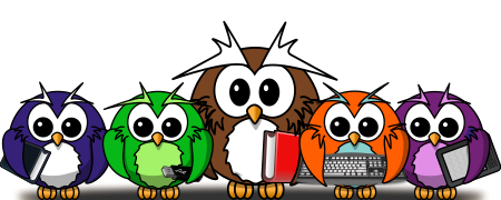 This features a group of five colorful owls standing next to each other. They are all holding books or technology gadgets, such as laptops and cell phones. Each owl is unique in terms of their colors, making the scene visually appealing. In addition to the owls, there is also a larger teacher owl in the middle, which stands out among the group. The arrangement of these colorful characters creates an interesting and engaging visual display.